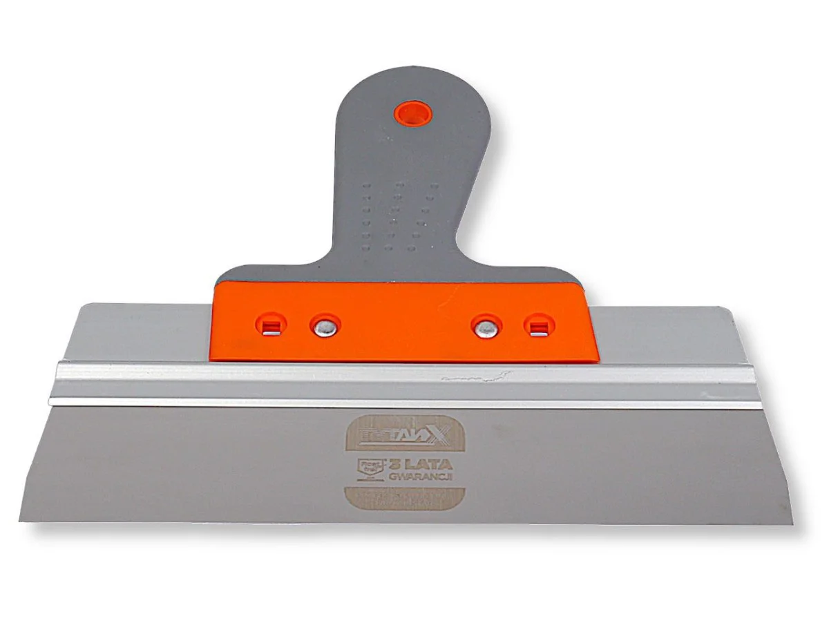 Szpachelka fasadowa TYTANX z uchwytem SOFT – profesjonalna szpachla ze stali nierdzewnej o wysokiej sprężystości (Rm 1500 MPa), przeznaczona do zaciągania gładzi i wyrównywania tynków. Dostępna w szerokościach 300, 350 i 450 mm, z ergonomicznym uchwytem typu SOFT i stabilnym profilem aluminiowym.