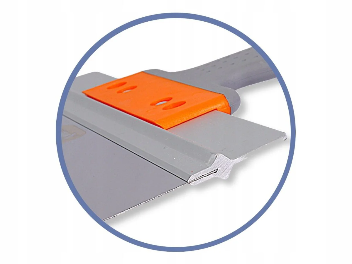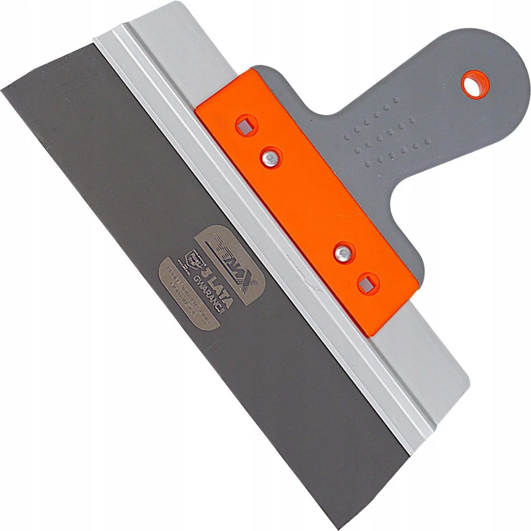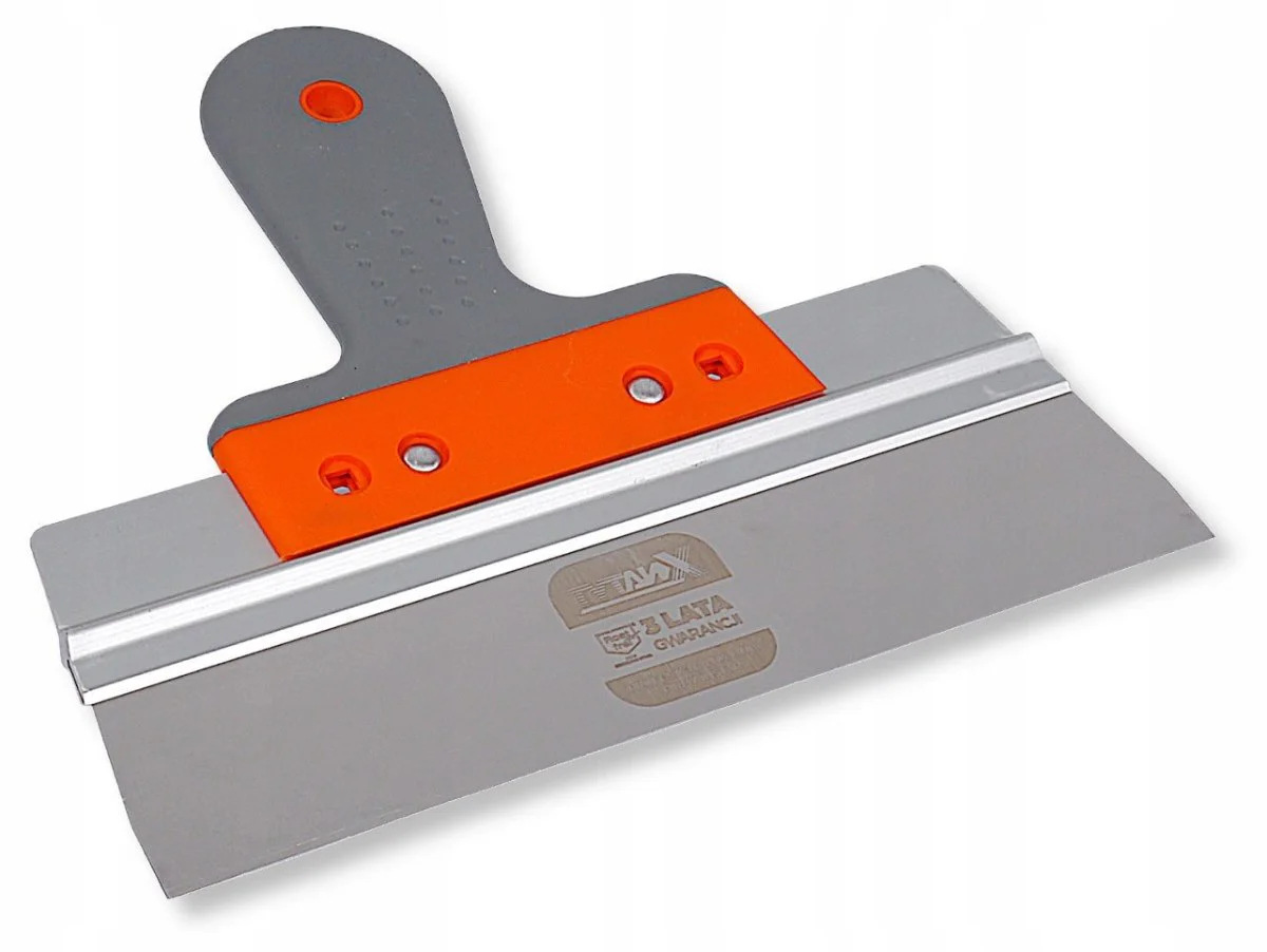 Ostrze szpachelki umieszczone jest w aluminiowym uchwycie, który jest trwale przymocowany do rękojeści za pomocą nitów. Taka konstrukcja zapewnia sztywność, stabilność oraz równomierne zużycie części roboczej na całej szerokości szpachelki, co ma kluczowe znaczenie przy pracy na większych powierzchniach ścian i sufitów.